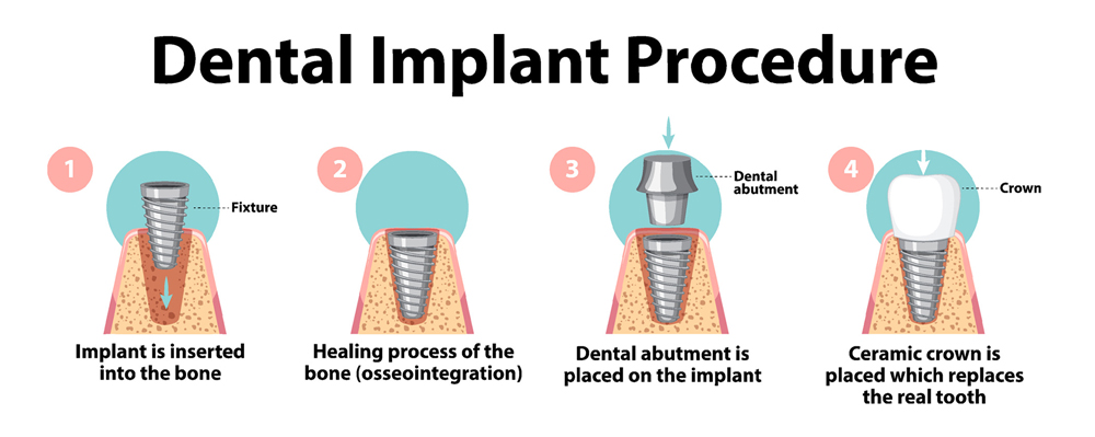 The dental implant procedure typically involves several steps. First, the dentist will numb the area and make a small incision in the gum to access the jawbone. Then, a small hole is drilled into the bone and the implant is placed. Over the next few months, the implant will fuse with the bone in a process called osseointegration. Once the implant is secure, a connector called an abutment is placed on top of the implant. Finally, a replacement tooth is attached to the abutment.